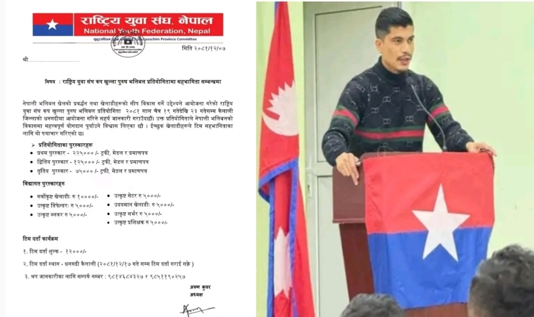 नेकपा एमाले निकट राष्ट्रिय युवा संघ नेपाल सुदूरपश्चिम प्रदेश कमिटीले आगामी चैत १९ गतेदेखि २३ गतेसम्म राष्ट्रिय युवा संघ कप–२०८१ भलिबल प्रतियोगिता आयोजना गर्ने भएको हो।