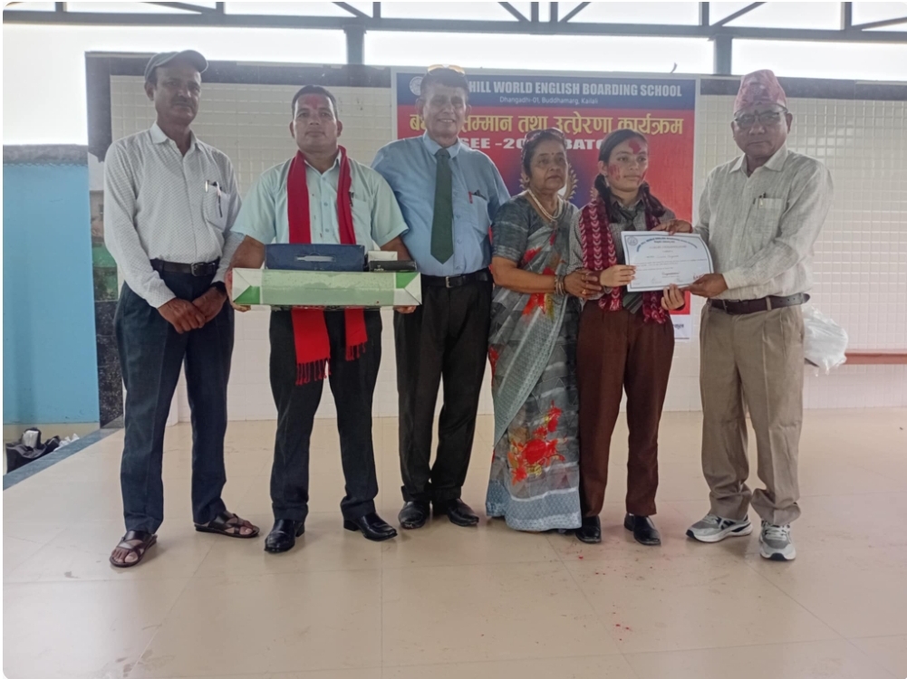 धनगढी । कैलालीको धनगढी उपमहानगरपालिका–१ मा अवस्थित हिलवर्ल्ड ईङ्गलिस बोर्डिङ स्कुलले कक्षा १० को एसईई परीक्षा २०८१ मा उत्कृष्ट नतिजा ल्याएका विद्यार्थीहरूलाई एक कार्यक्रममार्फत सम्मान गरेको छ।